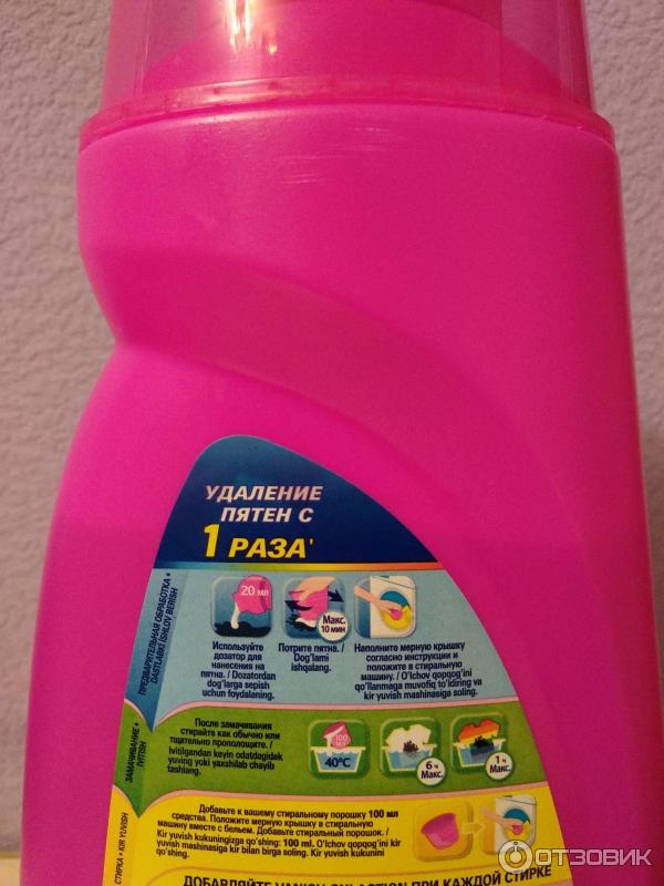 Na přední straně láhve vidíme hlasité sliby výrobce „různé typy skvrn“. Prověříme to trochu později. Ze zadní strany láhve se můžeme seznámit s několika způsoby odstranění skvrn v závislosti na znečištění a typu skvrny, musíme použít jednu nebo druhou metodu, to znamená, že bychom neměli očekávat zázrak – bez vynaložení úsilí na čištění; to.