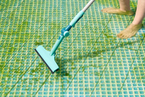 Zelené usazeniny lze odstranit kartáči se saponátem nebo vodním vysavačem (nevyžaduje vypouštění vody). Důležité je vyčistit všechny rohy, štěrbiny a záhyby, poté opatrně sebrat zbývající špinavou vodu škrabkou a vypustit. Na stěny čistého bazénu naneste prostředek proti řasám Algaecide.